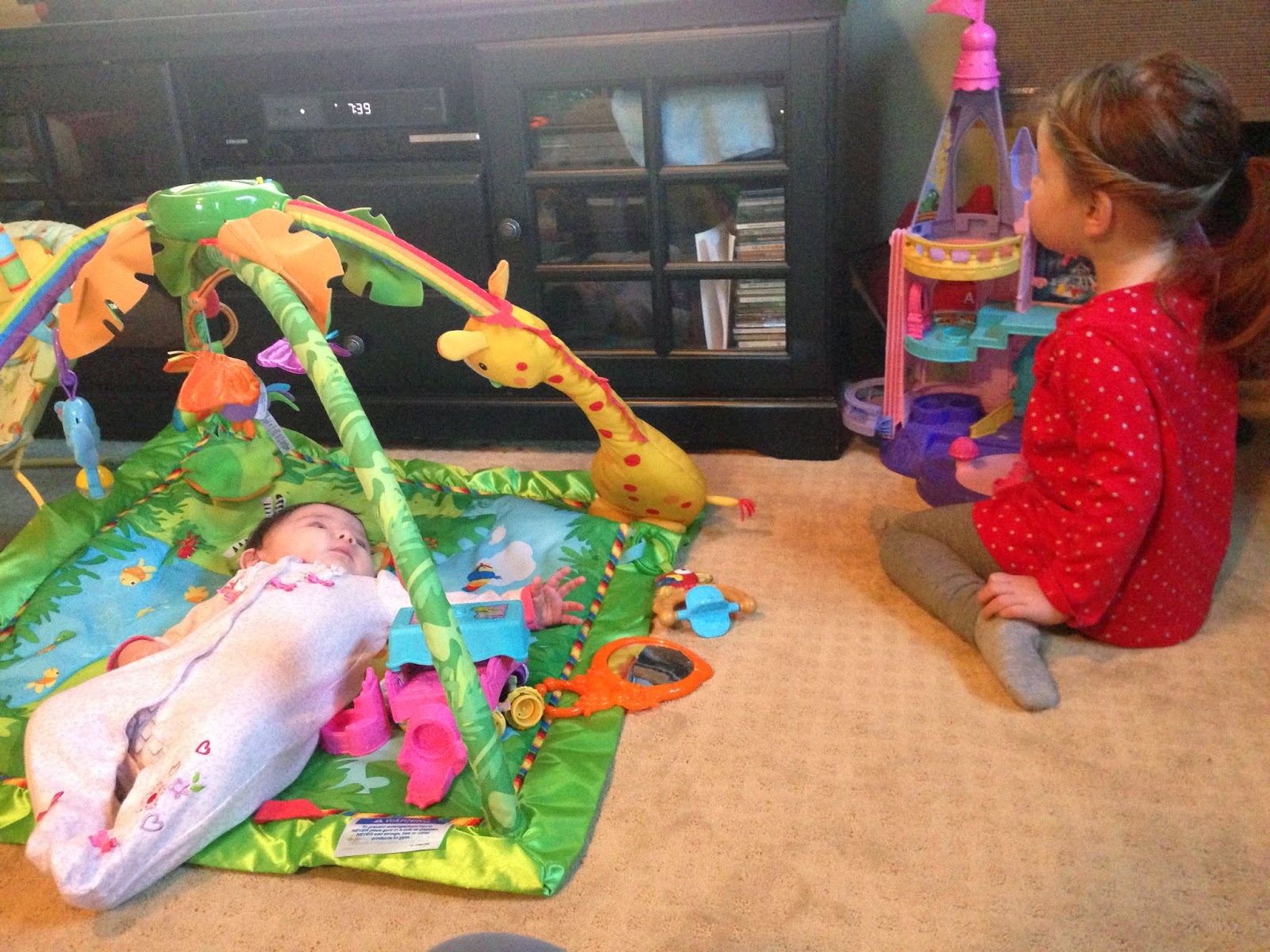 This week, I started going to school with my sister! I'm in the infant room downstairs, while my sister is upstairs in the toddler room. She's very, very busy learning big kid stuff and playing with her friends, so I don't see her much during the day. But we get to spend some time together in the afternoon while we wait for Daddy to come get us.